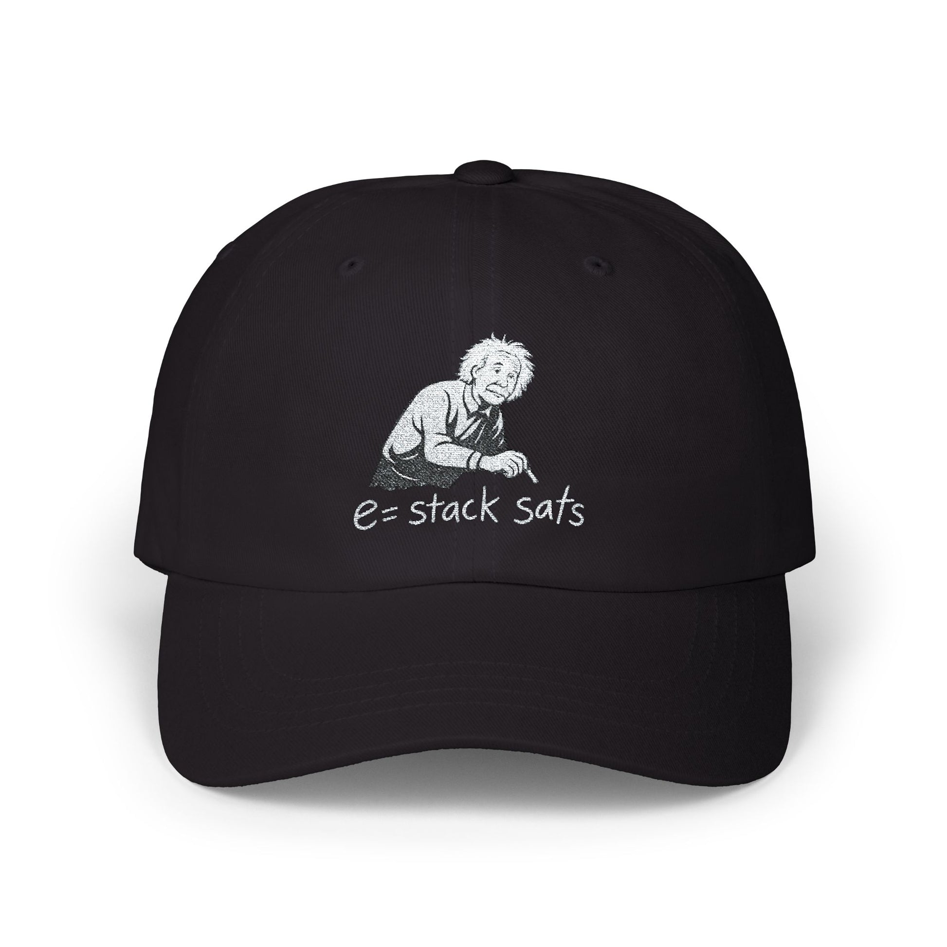This bitcoin-themed dad cap features Einstein writing on a blackboard with the phrase 'e=stack sats' instead of 'e=mc squared'. Perfect for bitcoin enthusiasts and tech-savvy individuals, this hat gives off a trendy and intellectual vibe. It is a great accessory for casual wear and can be worn on daily outings or at tech meetups. Ideal for gifting on birthdays, Christmas, or any special occasion.